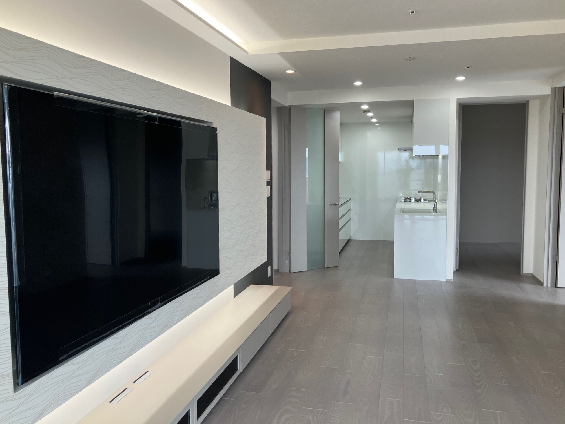 グレージュを基調に間接照明を効果的に取り入れ、落ち着きと高級感のあるリビングに仕上げました。