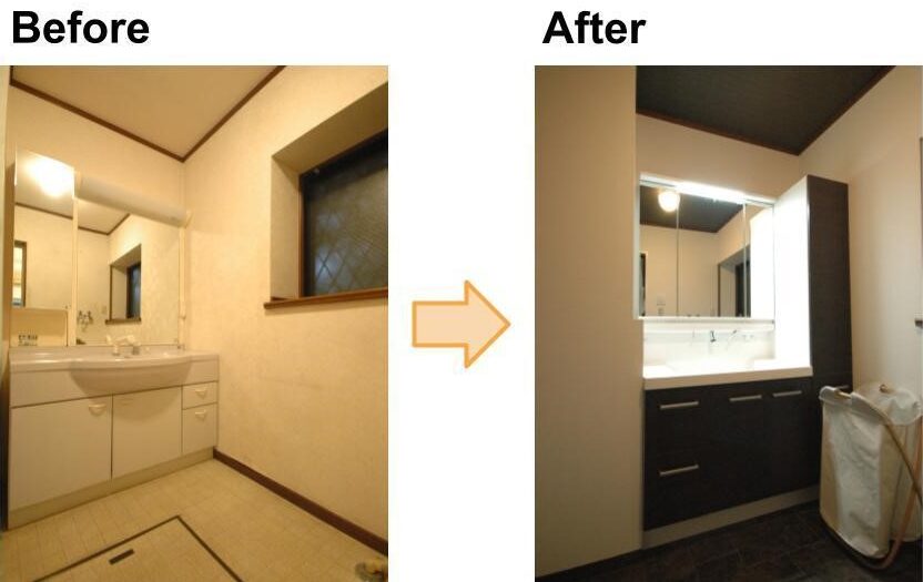 全体的に小さく収納スペースもほとんど無かった洗面台は、ワイドな洗面ボウルと収納のついたものに交換しました。ブラックのタイルを床材に採用し、シックな雰囲気を演出できています。