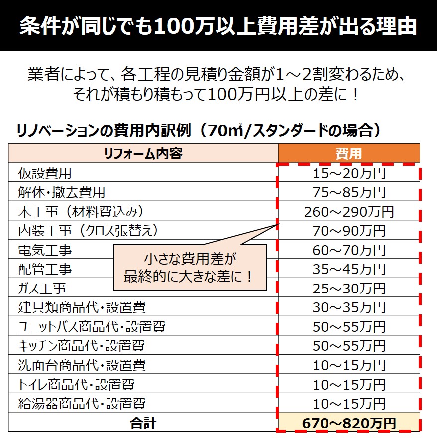 リノベーションは、解体、配管、木工事、内装仕上げといった数多くの工程が積み重なってできています。各工程で発生する1〜2割程度のわずかな費用差が、一軒分すべて合算されることで、最終的に数百万円という大きな差となって現れるのです。