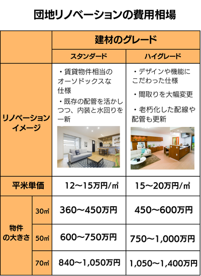 団地リノベーションの費用は、平米(㎡)単価 10万円〜20万円程度が一般的です。