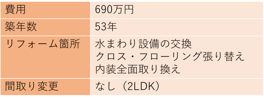 | リフォーム箇所 | ・水回り設備の交換 ・内装の張り替え ・間取り変更 |
