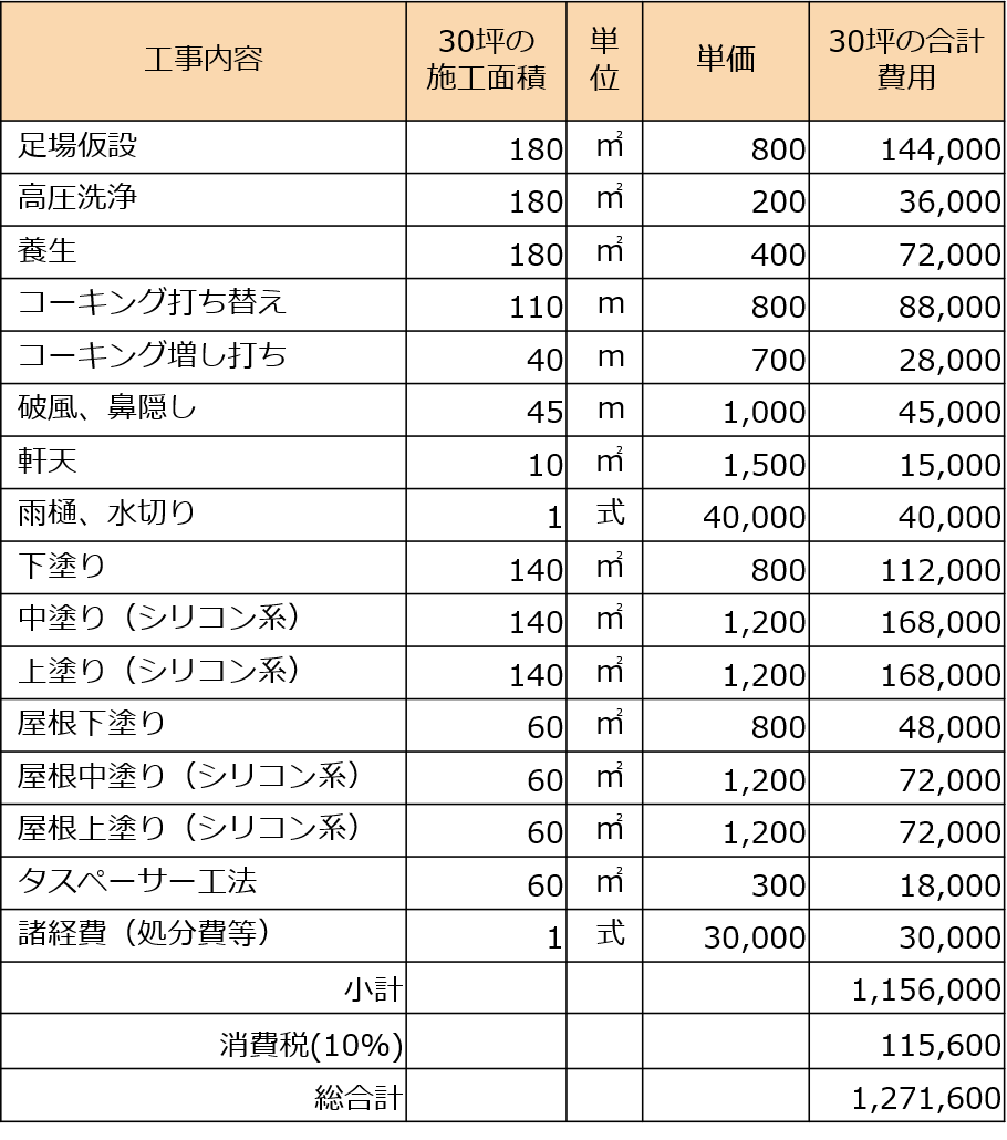 一般的な30坪の戸建ての外壁・屋根塗装の見積もり例です。外壁はサイディング、屋根はスレート屋根を想定しています。