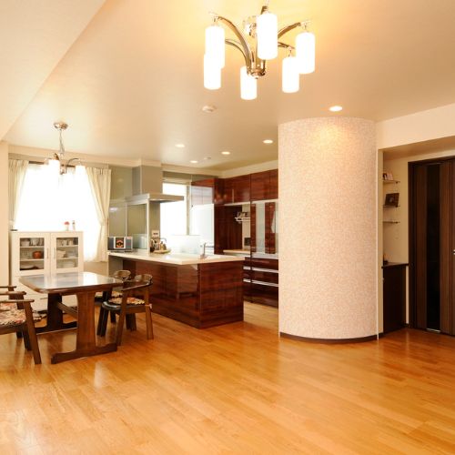 ダイニングキッチンと和室の間にある壁を撤去したことで、広々としたLDKが実現しました。キッチンは壁付きタイプから人気の対面式へと変更。キッチンまわりの目隠しに設けたアール壁が、空間に柔らかな雰囲気をもたらしています。