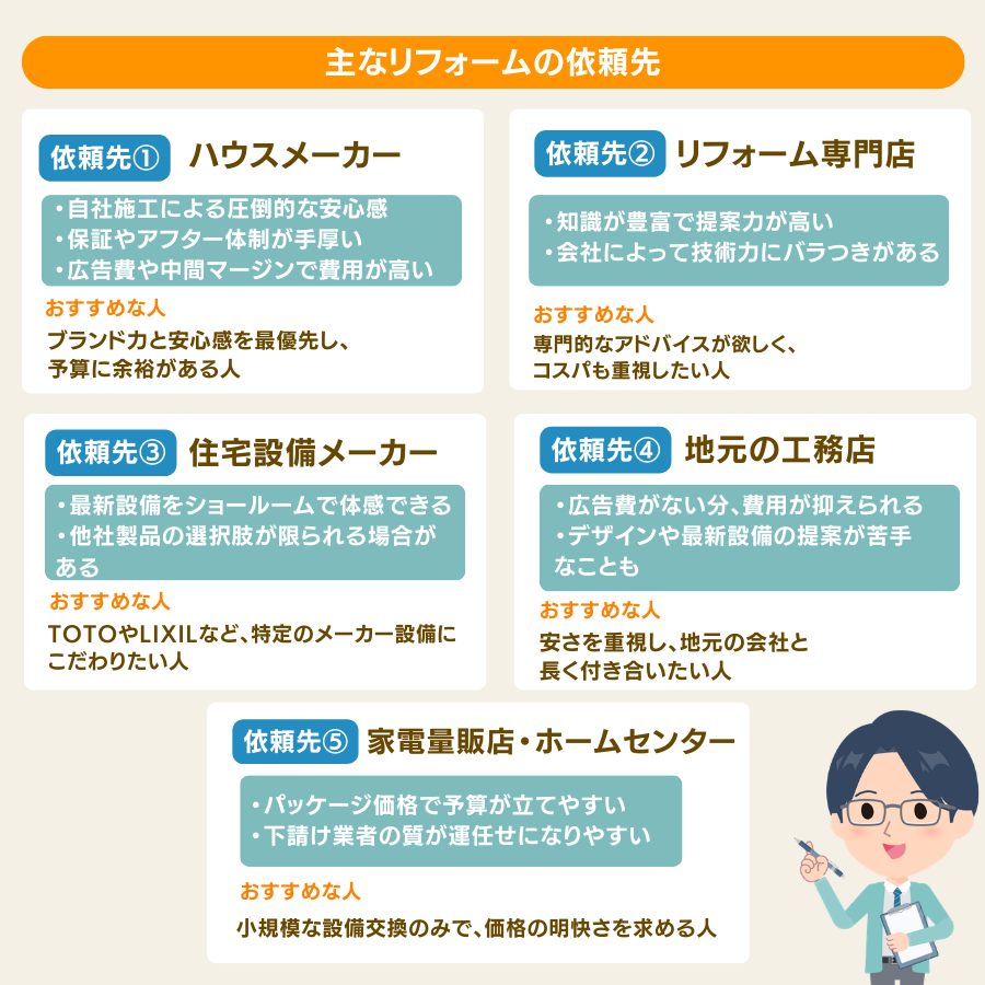 まずは、代表的な5つのリフォームの依頼先について、それぞれの特徴を確認していきましょう。