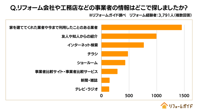 以下は、リフォームガイドがおこなった、リフォーム業者を探した方法についてのアンケート結果です。