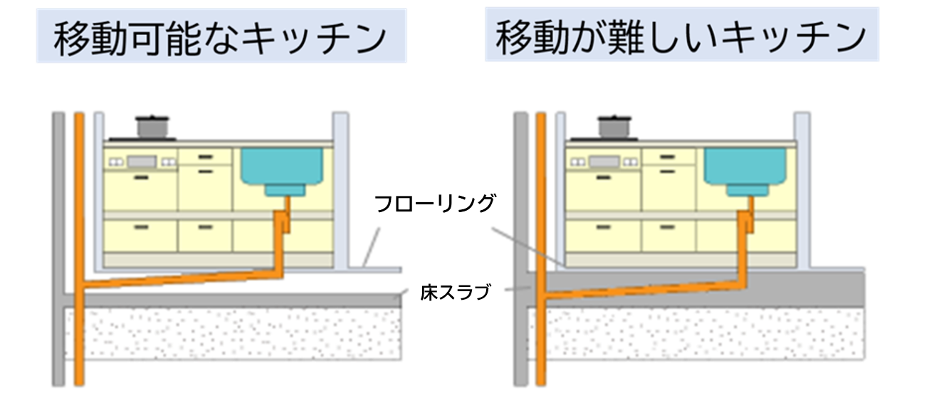 排水管においては、床スラブに埋め込まれているケースがあり、その場合はシンク位置をずらすことが難しいケースが多いでしょう。また、移動できる場合でも、排水管の勾配(傾斜)をとれる範囲での移動となります。