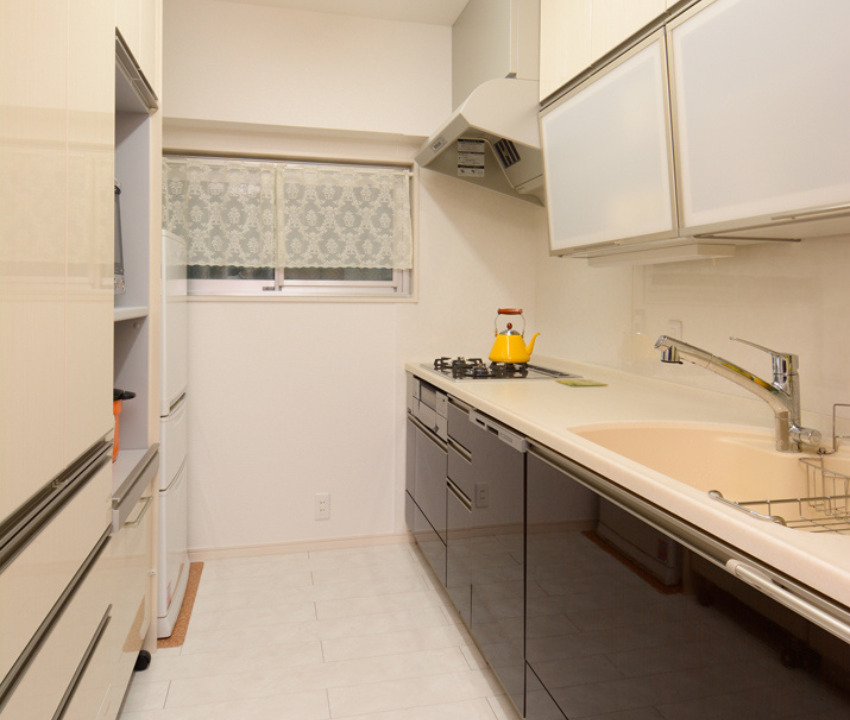 キッチンは最新の設備に交換し、もともとあった窓を生かし光が入るようにしました。内装も設備に合わせホワイトやライトベージュを採用し、明るく清潔感のある空間に仕上がっています。