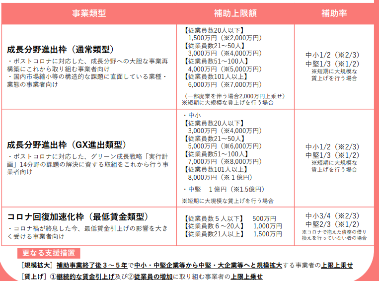 事業再構築補助金は3種類あり、目的に応じて次のように補助上限額と補助率が分かれています。