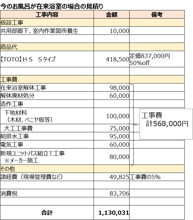 ユニットバスから新しいユニットバスにリフォームした見積もりの例