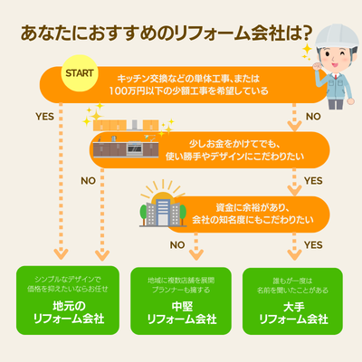 リフォーム会社は、規模や体制によって大きく3つのタイプに分けられます。それぞれ費用感や特徴がはっきりと異なるため、以下のフローチャートで自分にぴったりのタイプを見つけてみてください。